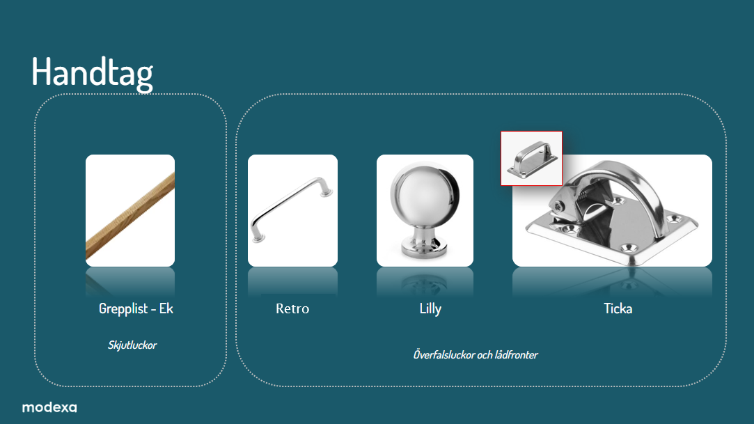 Retroluckan Elsa är en överfalslucka med moderna gångjärn från Grass men med tidstypiskt utseende utvändigt.